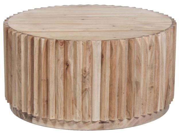 The circular tabletop gives the piece a soft, balanced look, while the vertical fluted detailing around the base adds depth, texture and a contemporary designer feel. Its low, solid profile makes it ideal for anchoring a lounge setting, pairing with modular sofas, or adding warmth to modern, coastal and organic-inspired interiors.