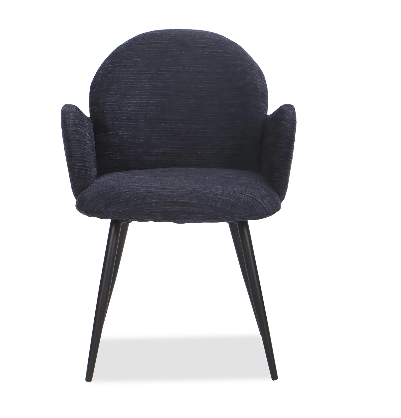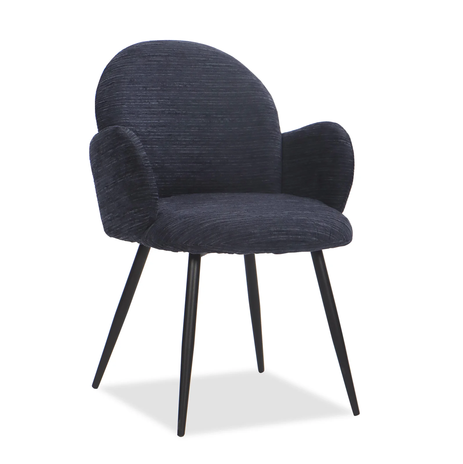 The upholstered seat and backrest offer everyday comfort, while the slim black legs keep the look clean and refined. Its rounded silhouette makes Stella a strong choice for dining rooms, kitchen settings, meeting areas or occasional seating where comfort and visual softness matter.