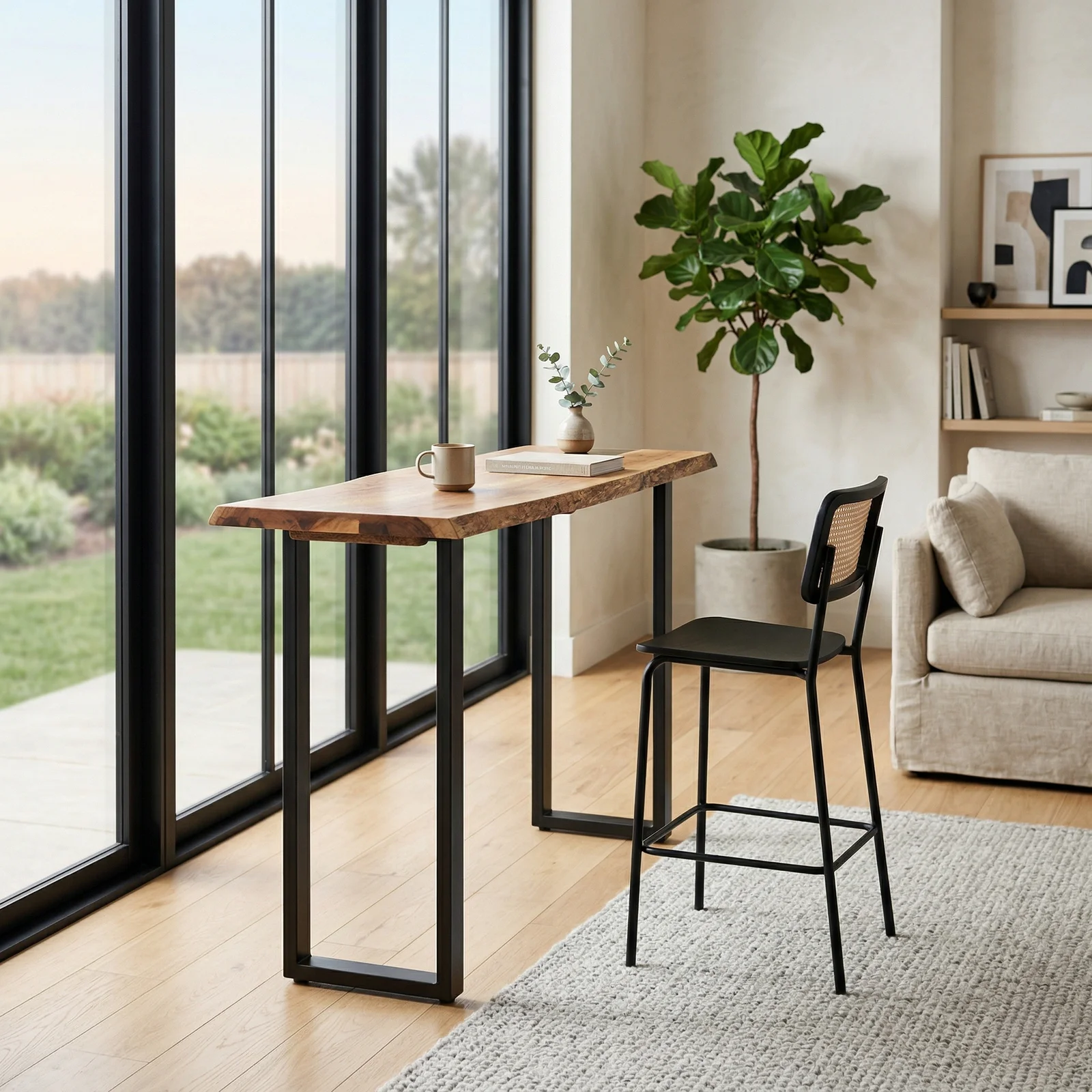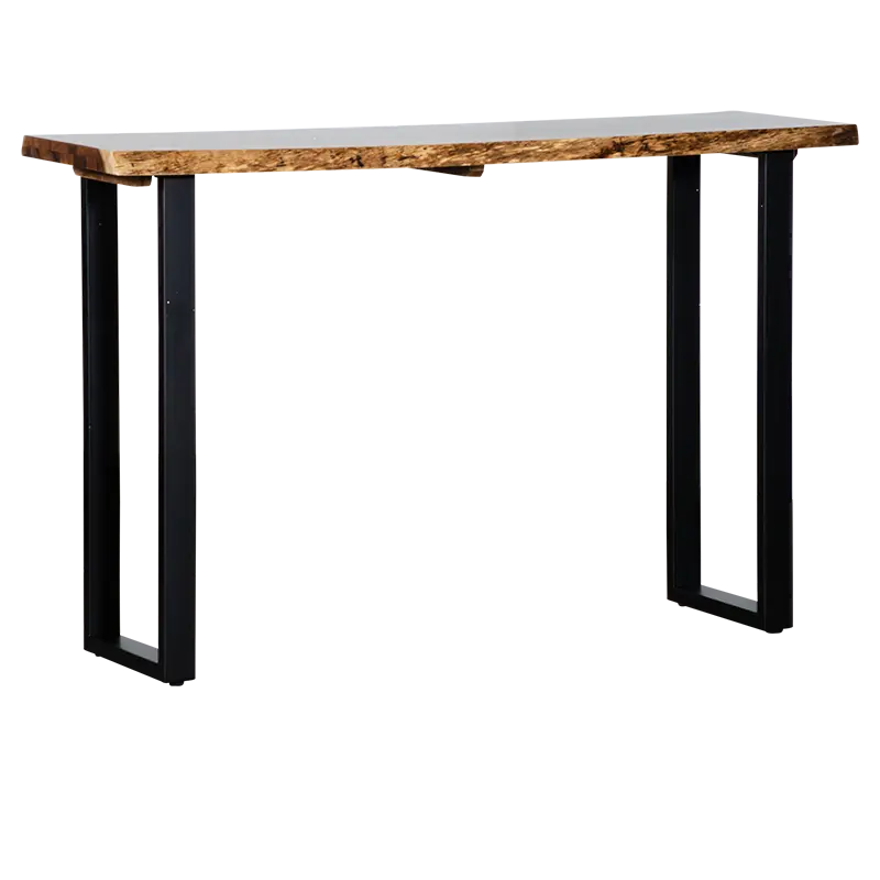 Embrace the captivating blend of light and dark tones, artfully complemented by distinctive live edge accents. Each bar table radiates rustic elegance, further elevated by the sleek black recess cavity for a refined aesthetic. Elevate your bar or entertainment space with the enduring sophistication of the Fortitude Collection, where craftsmanship meets timeless allure.